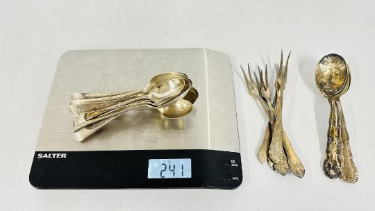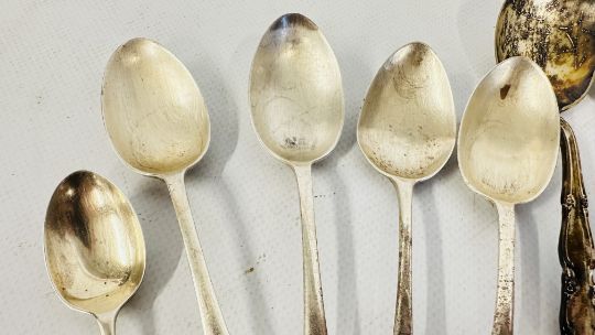 A GROUP OF 11 ASSORTED SILVER SPOONS, VARIOUS DATES AND MAKERS + A FURTHER 6 SILVER PLATED EXAMPLES AND 6 PICKLE FORKS.