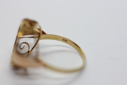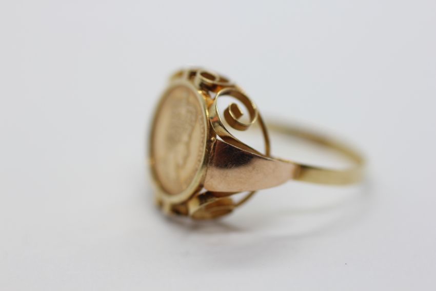 A COMMEMORATIVE COIN RING STAMPED 585, THE COIN MARKED I.M. KONIGIN ELIZABETH 11, STAMPED 585.