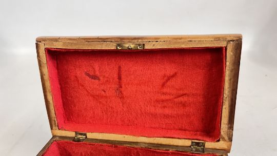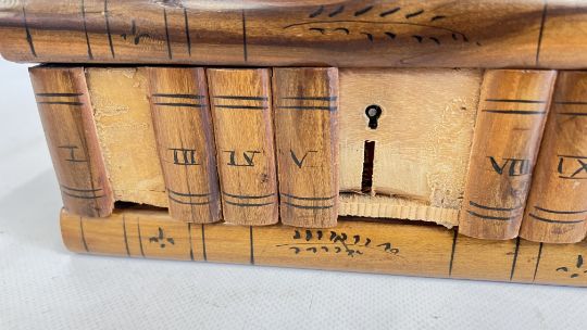 AN OLIVE WOOD BOX DESIGNED AS A ROW OF BOOKS, WITH 'SECRET' COMPARTMENT, THE TOP WITH SWALLOW AND 'FALSE TUNBRIDGE WARE' CORNER DECORATION, W 23 X D 13.5 X H 10CM.