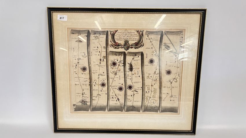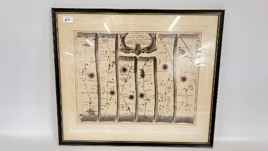 A VINTAGE FRAMED AND MOUNTED MAP "THE ROAD FROM KINGS LYNN TO NORWICH" BY JOHN OGILBY, W 46.5 X H 36CM.