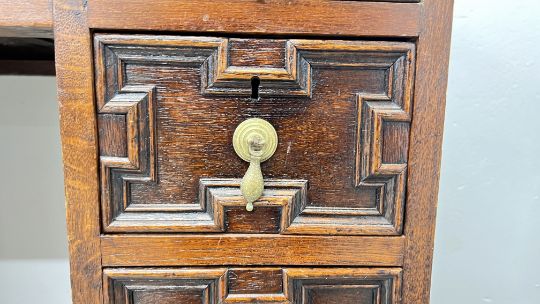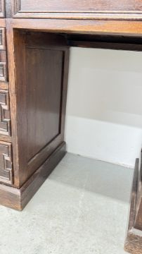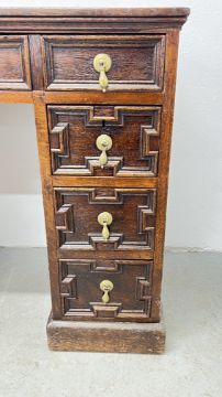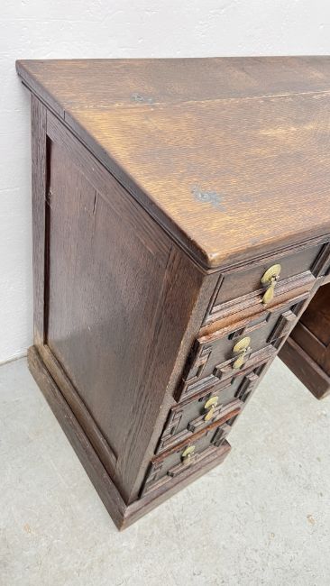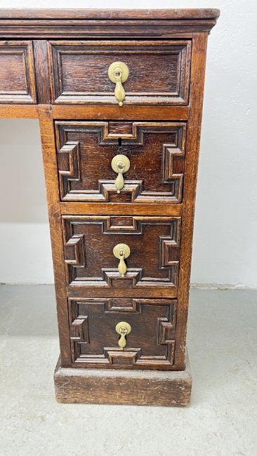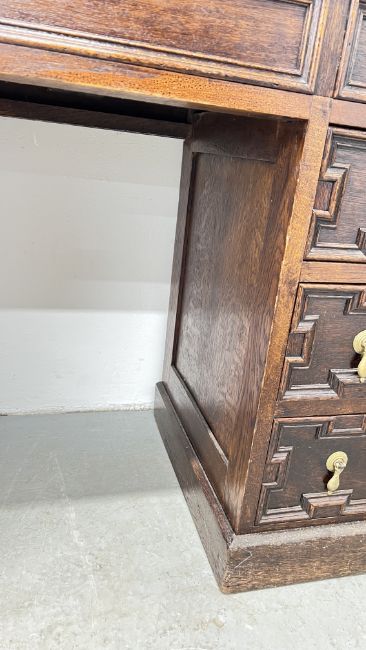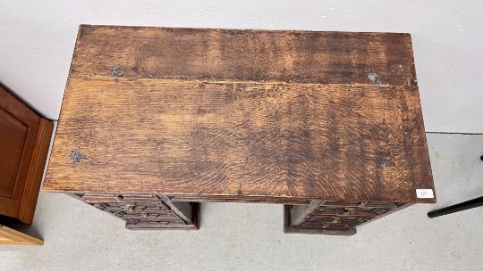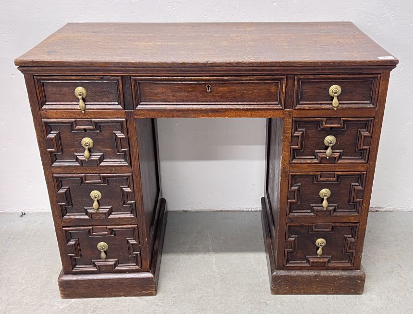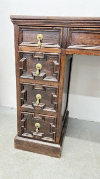 ANTIQUE JACOBEAN STYLE OAK 7 DRAWER KNEEHOLE DESK, W 96, D 49, H 76CM.