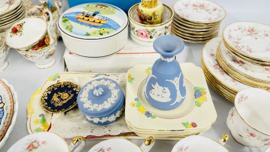 THREE BOXES OF SUNDRY CHINA TO INCLUDE ROYAL ALBERT OLD COUNTRY ROSES & DAMASK TEA WARE, PARAGON VICTORIANA ROSE TEA WARE, WEDGWOOD BLUE JASPER WARE, COALPORT INDIAN TREE BOXED MINIATURES, SMALL AYNSLEY TWO HANDLED VASE A/F.