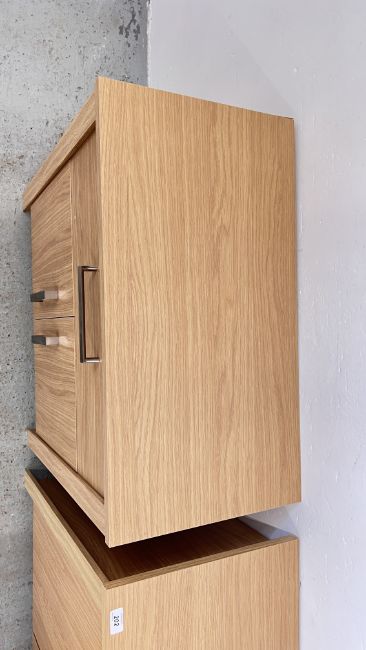 THREE PIECES OF OAK FINISH HOME FURNITURE TO INCLUDE TWO DOOR ENTERTAINMENT STAND, TWO DOOR THREE DRAWER SIDEBOARD AND TWO DOOR SINGLE DRAWER CABINET.