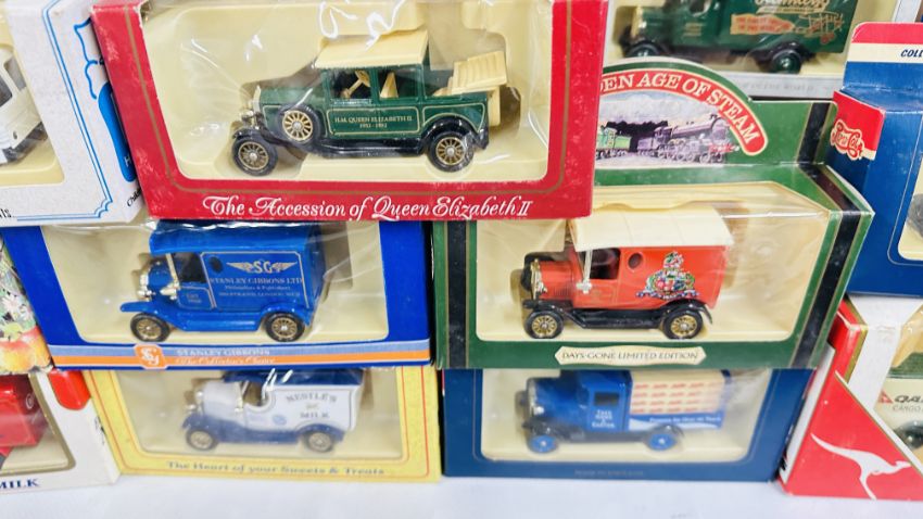A BOX OF ASSORTED DIE CAST MODEL VEHICLES, ADVERTISING VANS AND BUSES TO INCLUDE HAMLEYS, QANTAS, PEPSI-COLA AND RUPERT EXAMPLES IN ORIGINAL PRESENTATION BOXES.