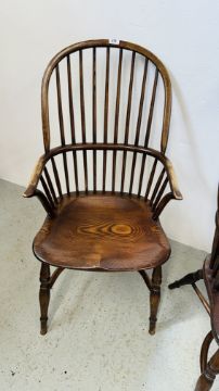 A PAIR OF REPRODUCTION WINDSOR STICKBACK ARMCHAIRS, THE ELM SEATS ABOVE TURNED LEGS, JOINED BY CRINOLINE STRETCHERS.