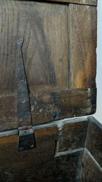 A LATE C17th OAK COFFER, THE THREE PANELLED TOP ABOVE A CARVED RAIL AND THREE LOWER PANELS (SOME REPAIRS), HINGES LATER, WIDTH 99.5CM.