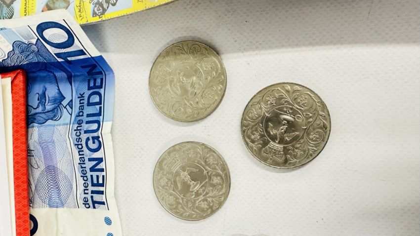 A GROUP OF LOOSE STAMPS + A MODERN POSTCARD ALBUM AND A VINTAGE STAMP ALBUM AND CONTENTS + A SMALL GROUP OF ASSORTED COINAGE AND BANKNOTES TO INCLUDE SILVER EXAMPLES, CIGAR PRESENTATION BOX, COLIBRI LIGHTER.