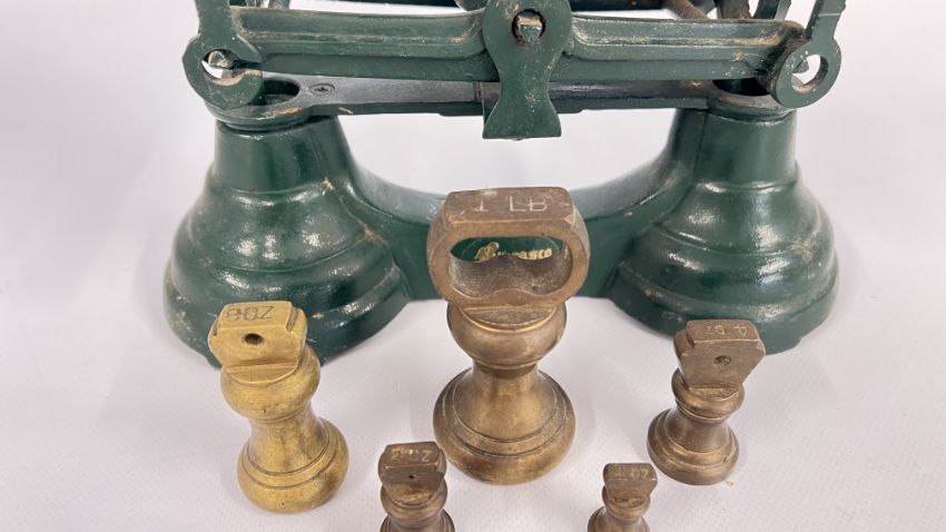VINTAGE "LIBRASCO" WEIGHING SCALES WITH 7 BRASS WEIGHTS.