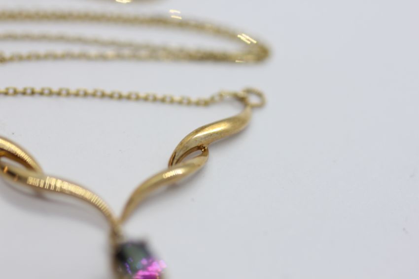 A MODERN 9CT GOLD PENDANT NECKLACE SET WITH A MULTI COLOURED OVAL STONE & A SMALL DIAMOND ABOVE IN PRESENTATION BOX.