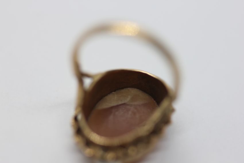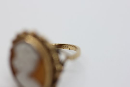 AN ORNATE YELLOW METAL CAMEO RING.