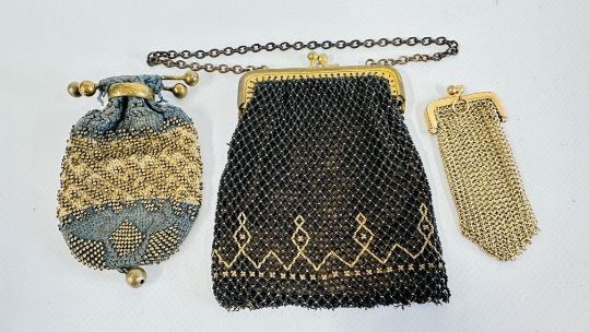 A VINTAGE YELLOW METAL PURSE AND A FURTHER TWO BEAD WORK PURSES.