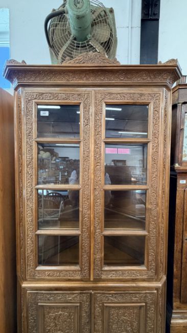A HEAVILY CARVED HARD WOOD FLOOR STANDING CORNER CABINET WITH CUPBOARDS TO BASE, W 80CM, H 190CM. (KEYS WITH AUCTIONEER).