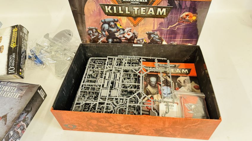 SELECTION OF WARHAMMER STARTER SETS, MINIATURES AND SPRUES TO INCLUDE (1 LARGE BOX): 1. WARHAMMER AGE OF SIGMAR KHARADRON OVERLORDS MINIATURES - PART ONLY WITH MOST PARTS STILL ATTACHED TO SPRUES. 2. WARHAMMER 40K INDOMITUS - PART ONLY TO INCLUDE SPACE MARINE SQUAD, ATTACK BIKES AND COMMAND SQUAD. MOSTLY STILL ATTACHED TO SPRUES. 3. WARHAMMER 40K KILL TEAM STARTER SET - SKIRMISH COMBAT IN THE 41ST MILLENIUM-REIVER MINIATURES STILL ATTACHED TO SPRUES, WITH CORE MANUAL, BOOKS, BOARD AND PLAYING CARDS. 4. WARHAMMER 40K ADEPTUS ASTARTES DEATHWATCH CORVUS BLACKSTAR MINIATURE - PART COMPLETED WITH INSTRUCTIONS AND STAND. 5. WARHAMMER 40K DREADNOUGHT - PART COMPLETED WITH REMAINING PARTS STILL ATTACHED TO SPRUES. 6. WARHAMMER 40K ADEPTUS ASTARTES DEATHWATCH KILL TEAM MINIATURES - PART COMPLETED WITH INSTRUCTIONS AND REMAINING PARTS STILL ATTACHED TO SPRUES. 7. WARHAMMER 40K SPACE MARINE LAND SPEEDER.