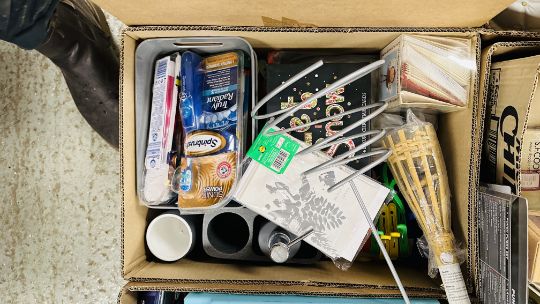 17 X BOXES OF ASSORTED HOUSEHOLD SUNDRIES TO INCLUDE SLATE PLACEMENTS, CANDLES, BOXED AS NEW TOOTHBRUSH, CLEANING CHEMICALS, VARIOUS VASES, KITCHENALIA, 3 X BOXED TOILET SEATS ETC.