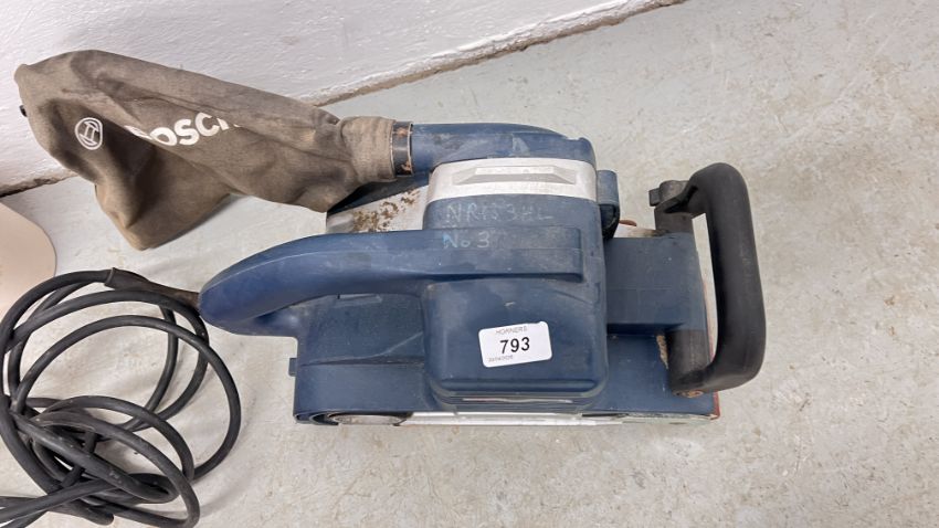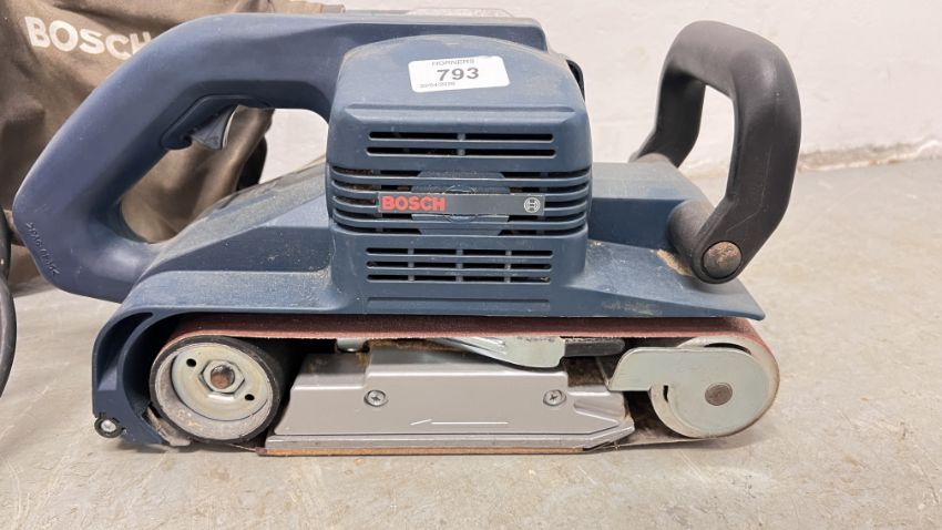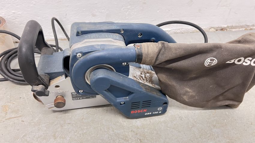 BOSCH GBS 100A PROFESSIONAL HEAVY DUTY BELT SANDER COMPLETE WITH DUST BAG AND SANDING BELTS - SOLD AS SEEN.