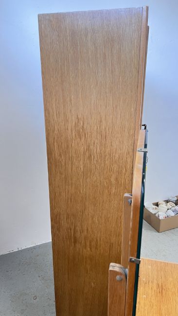 A SCHREIBER VANITY UNIT WITH CUPBOARDS ABOVE MIRROR AND FOUR DRAWERS BELOW, ALONG WITH A SCHREIBER COMBINATION WARDROBE.