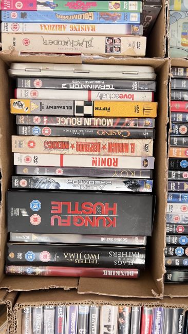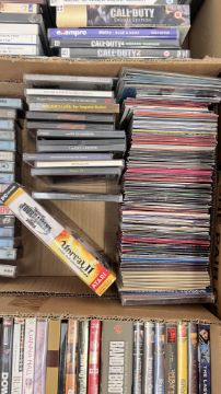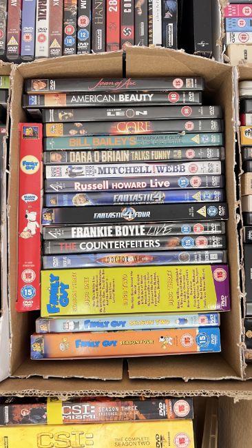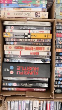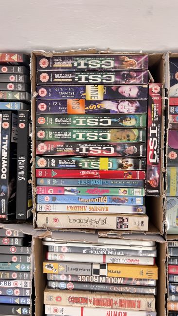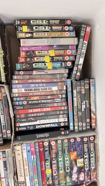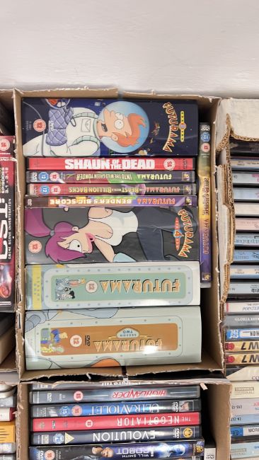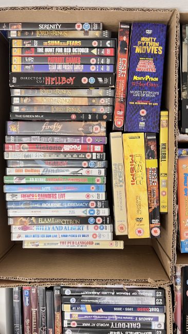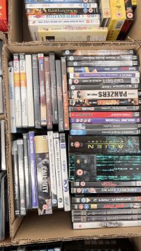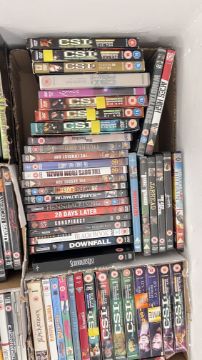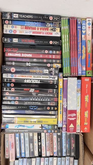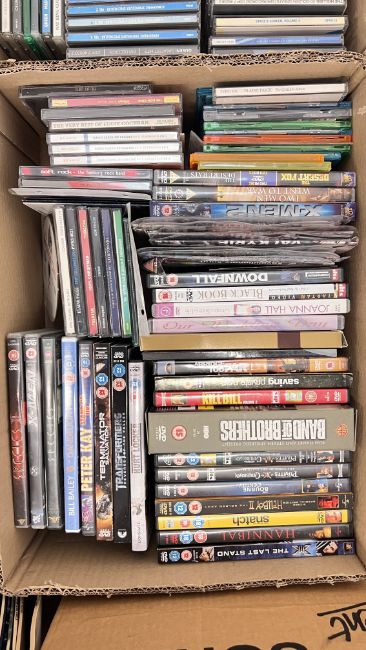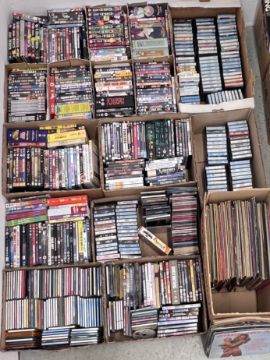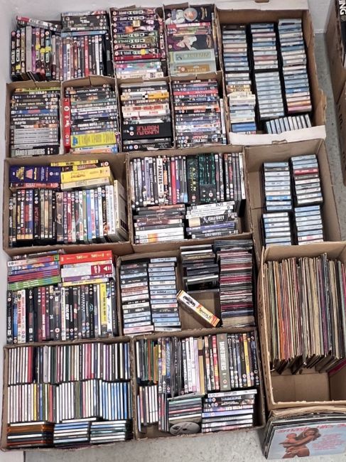 16 X BOXES OF DVD'S, CD'S, CASSETTES, VIDEO GAMES AND RECORDS, THE DVD'S TO INCLUDE ACTION, HISTORY, COMEDY, BAND OF BROTHERS BOX SET, FUTURAMA, C.S.I, ETC., VARIOUS CASSETTES, CD'S AND RECORDS TO INCLUDE ABBA, TOP OF THE POPS ETC.