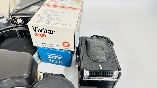 TWO BOXES OF ASSORTED CAMERAS INCLUDING SLR, BOX INSTANT, BROWNIE, PRACTIKA, ZENIT, FLASHES ETC. - SOLD AS SEEN.