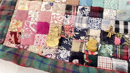 A PATCHWORK PANEL WITH ATTACHED CHRISTMAS CHARM / PENDANTS + A VINTAGE MOURNING BROOCH, PHOTO LOCKET AND A CARVED JADE PENDANT MOUNTED IN NEEDLEWORK FRAMES + A SILVER CASED POCKET WATCH A/F.