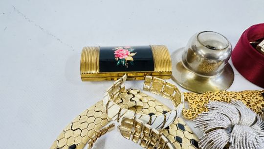 A BOX OF ASSORTED COSTUME JEWELLERY TO INCLUDE GOLD TONE EVENING JEWELLERY, VINTAGE BROOCHES, CUFF LINKS, ETC.