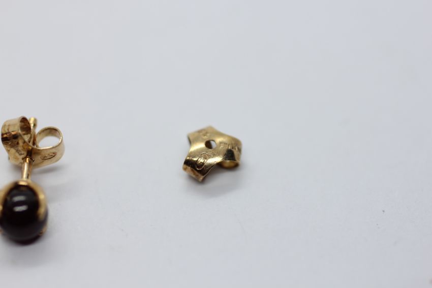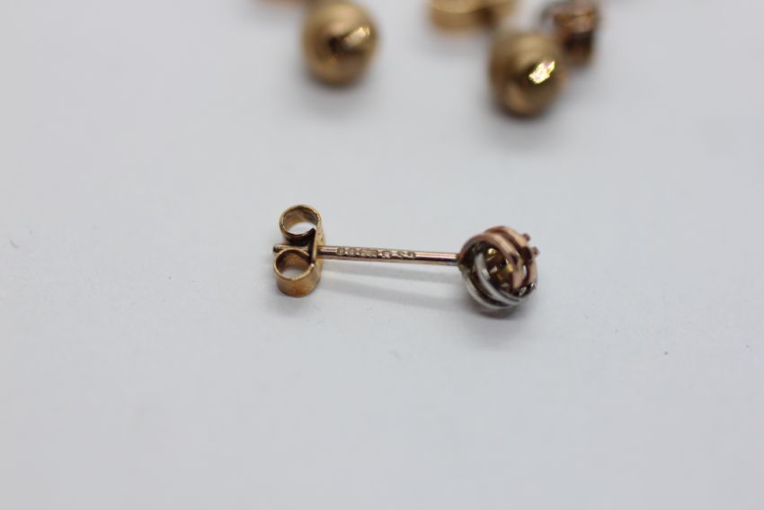 THREE PAIRS OF 9CT GOLD STUD EARRINGS TO INCLUDE A PAIR OF TRI-COLOURED KNOT EXAMPLES.
