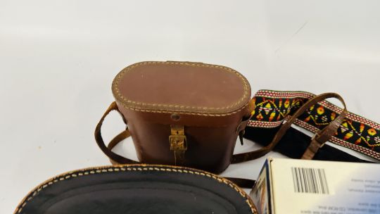 TWO BOXES OF ASSORTED VINTAGE CAMERAS AND BINOCULARS INCLUDING BOX CAMERAS, PENTACON, KODAK, CANON, FLASH ETC. - SOLD AS SEEN.