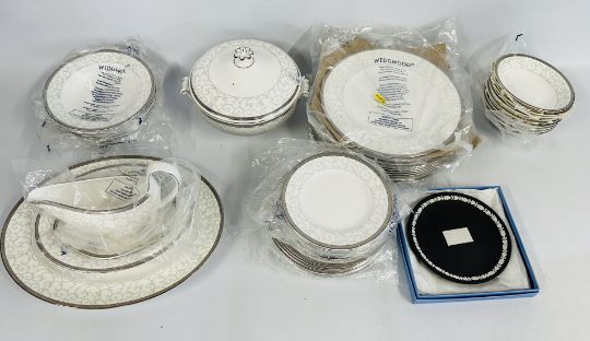 A QUANTITY OF WEDGWOOD CELESTRIAL PLATINUM DINNER WARE APPROX 47 PIECES PLUS WEDGWOOD JASPER WARE "ST GEORGE & DRAGON" STAMP DESIGN PLATE, BOXED.