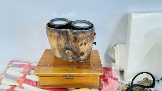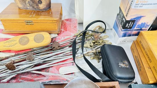 TWO BOXES OF COLLECTABLES TO INCLUDE CIGAR BOXES AND TANKARDS, VINTAGE BINOCULARS AND MODERN CAMERAS MAGINON ETC + CONCORDE RELATED EPHEMERA + VINTAGE PENS TO INCLUDE PARKER AND SHEAFFER.
