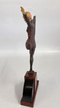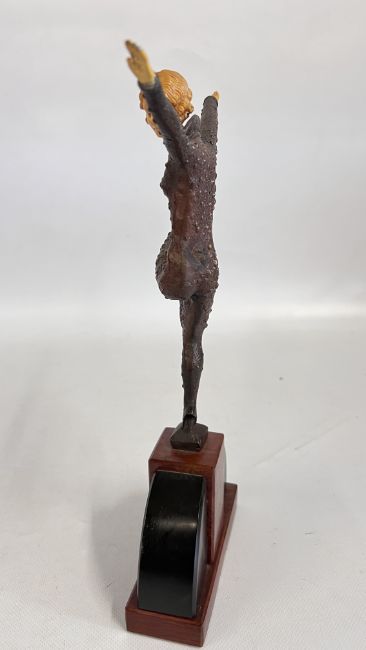 A DANCER STANDING ON ONE LEG HER ARMS OUTSTRETCHED, WITH COMPOSITION HEAD AND HANDS: SIGNED 'CHIPARAS', AND AFTER AN ORIGINAL BY HIM: ON TWO COLOUR ARCHED STONE PLINTHS, H 33CM.