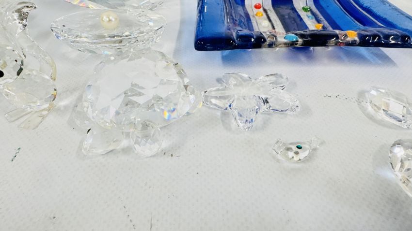 A GROUP OF ART GLASS DISHES AND VASES + A MURANO STYLE FUSED ART GLASS TRINKET DISH AND A GROUP OF CRYSTAL CABINET ORNAMENTS TO INCLUDE SWAROVSKI EXAMPLES (OWL A/F).