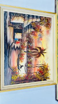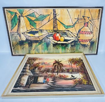 AN IMPRESSIVE FRAMED ABSTRACT, UNSIGNED, W 120 X H 60CM + A FRAMED OIL ON BOARD DEPICTING AN EASTERN VILLAGE BEARING SIGNATURE R.A. FOLY, W 74 X H 55CM.