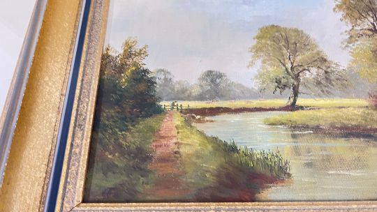 A GROUP OF 3 FRAMED ARTWORKS TO INCLUDE AN OIL ON CANVAS, RIVER LANDSCAPE INDISTINCT SIGNATURE + OIL ON BOARD "NEAR MALMESBURY" BEARING SIGNATURE E.J. WILSON + JANE CORT WATERCOLOUR "THE BROADS IN WINTER".