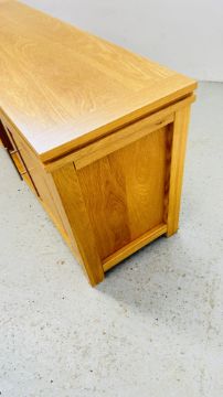 A MODERN LIGHT OAK TELEVISION STAND WITH CUPBOARD AND SHELVED BASE, WIDTH 133CM.
