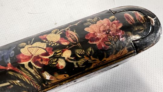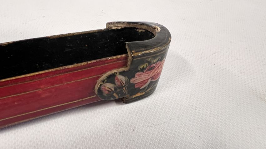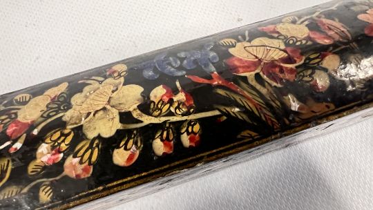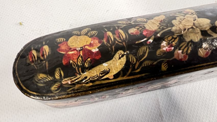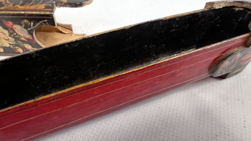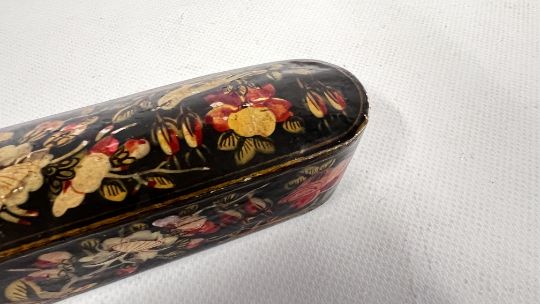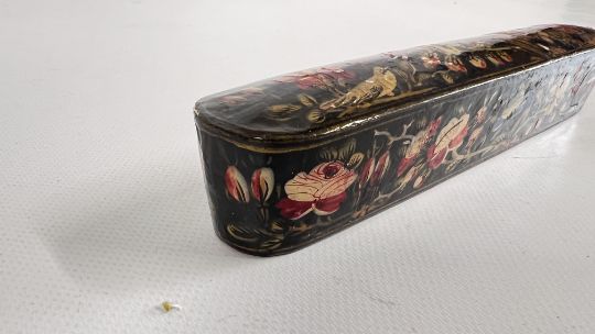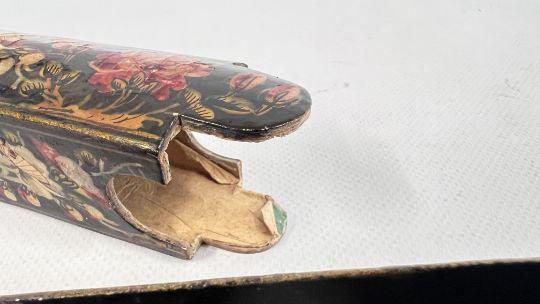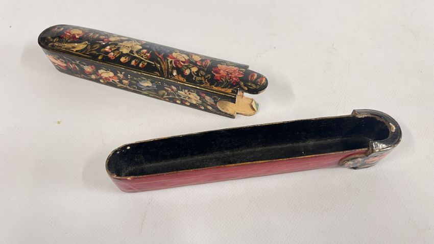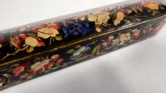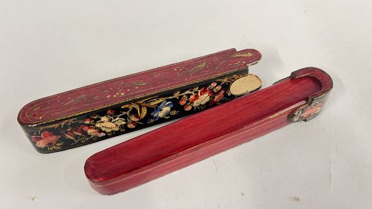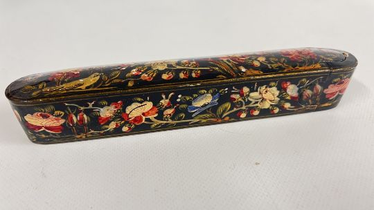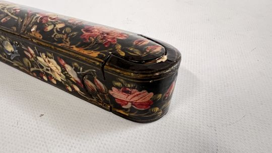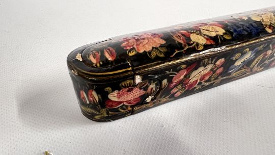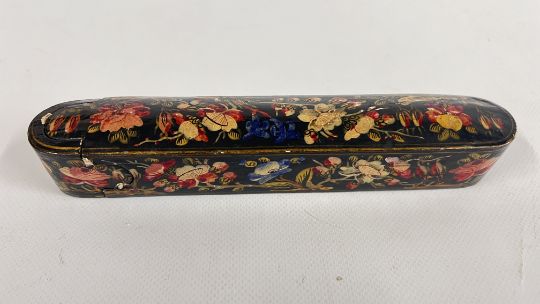A PERSIAN QUJAR PERIOD LACQUERED PAPER MACHE PEN BOX.