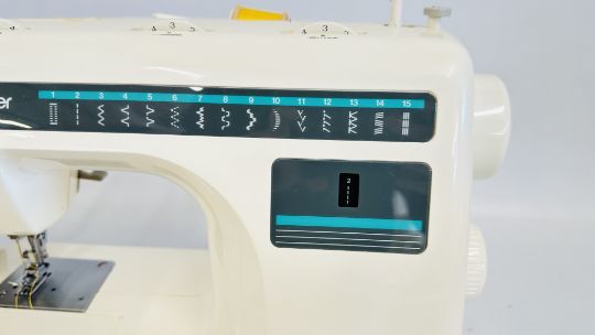 BROTHER PS-33 SEWING MACHINE PLUS A BOX OF ASSORTED THREADS, FABRICS ETC.