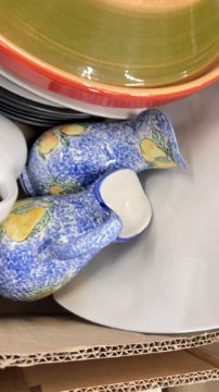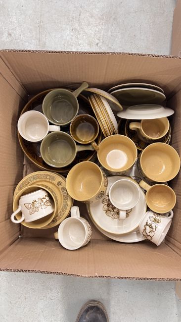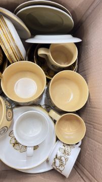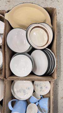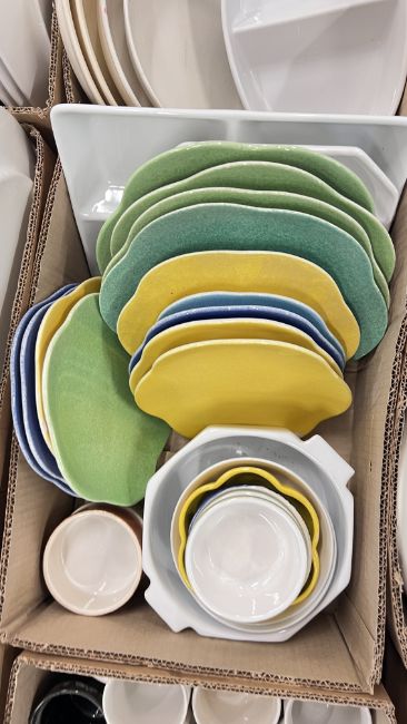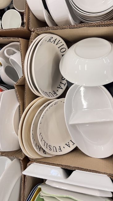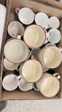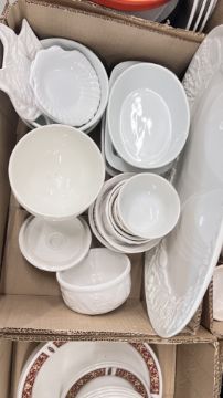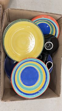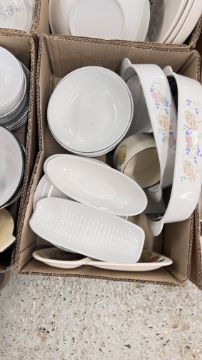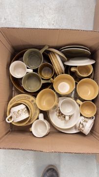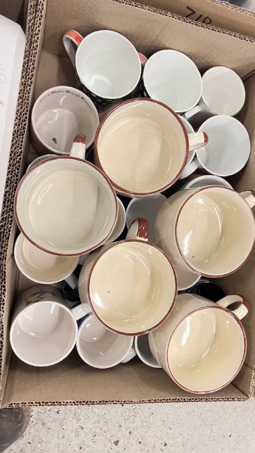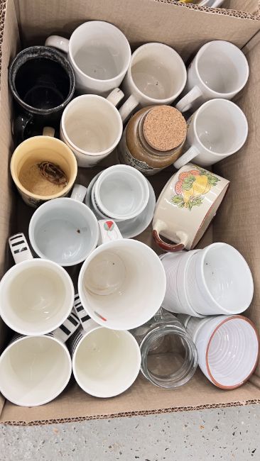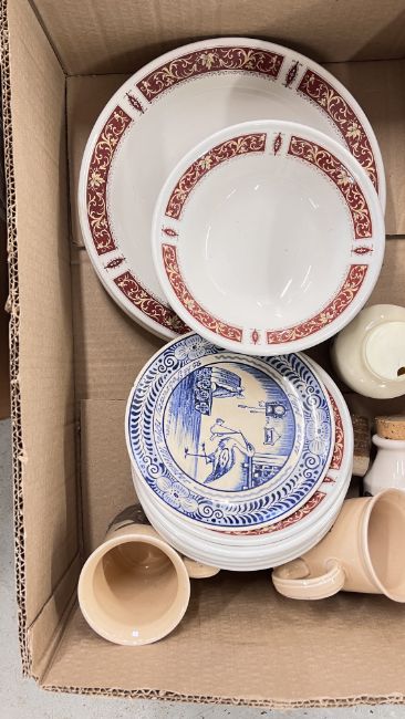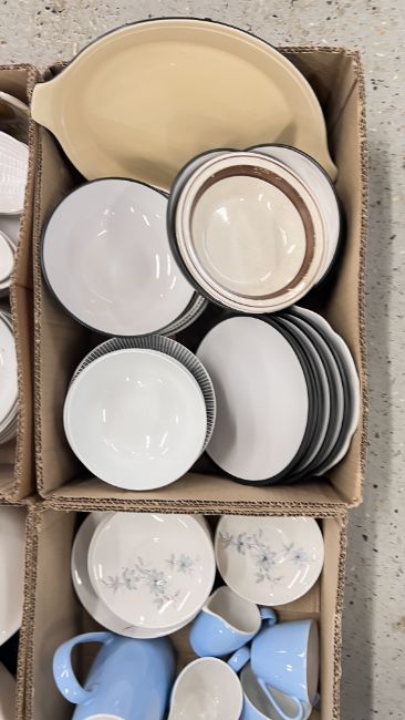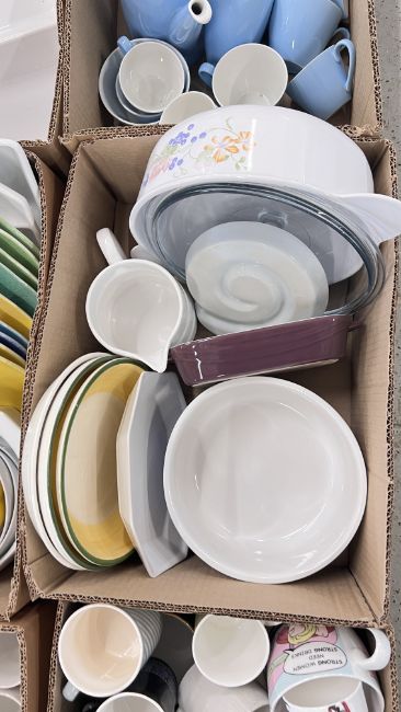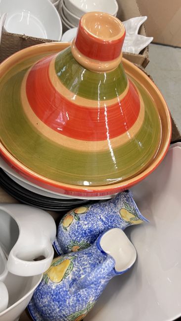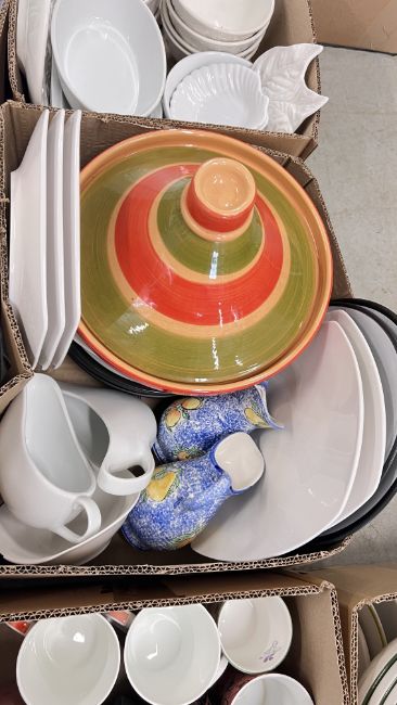 14 X BOXES OF ASSORTED KITCHEN CERAMICS AND TABLEWARE TO INCLUDE TAGINE, PLATES, BOWLS, CUPS, MUGS, CASSEROLE DISHES, AMONG OTHER EXAMPLES.