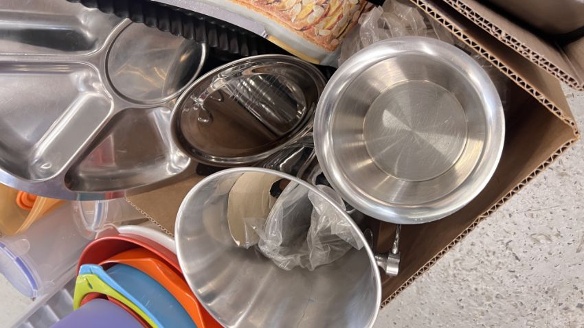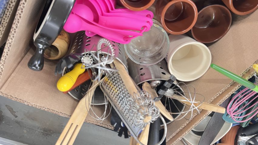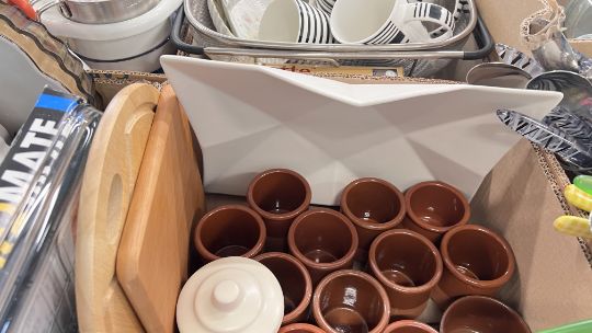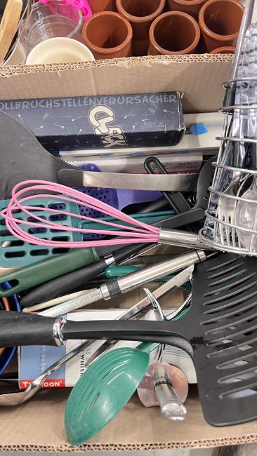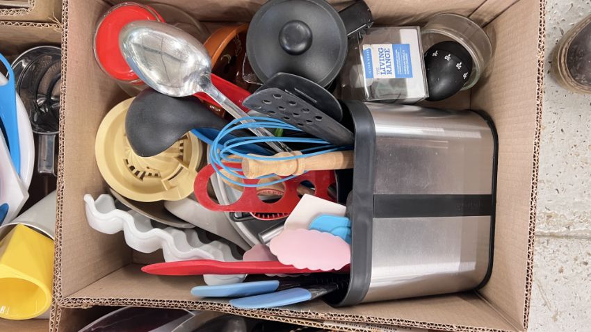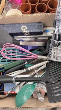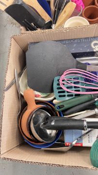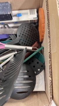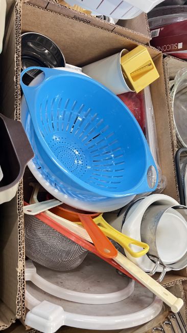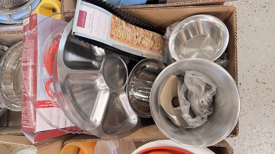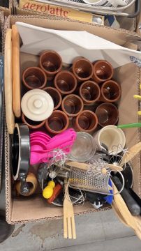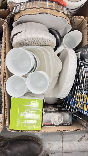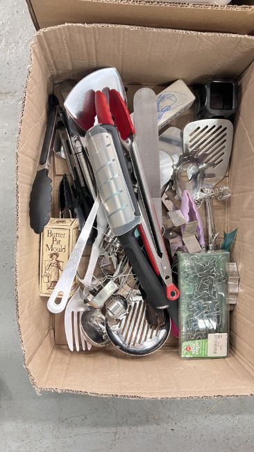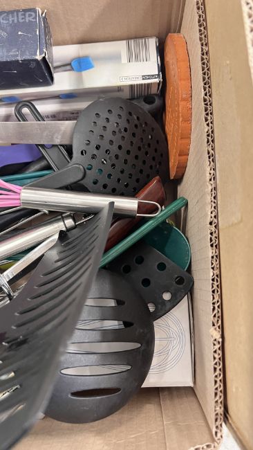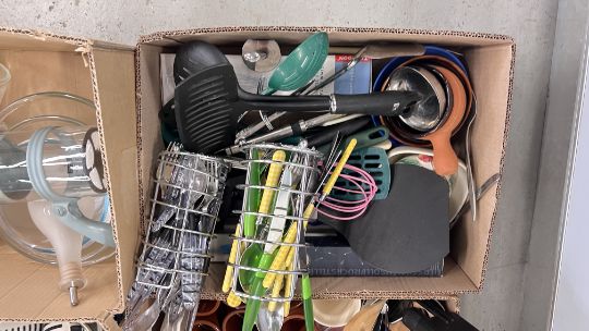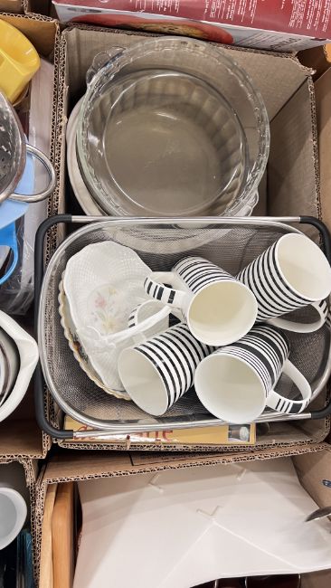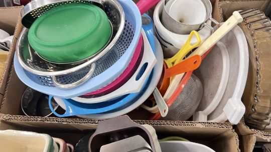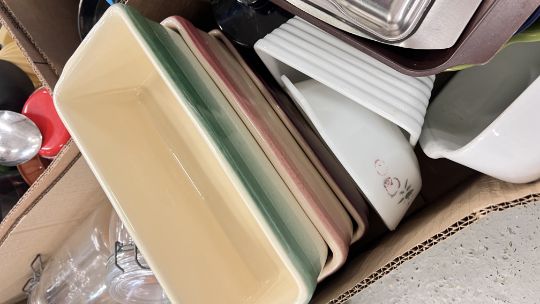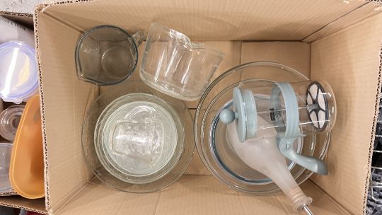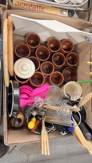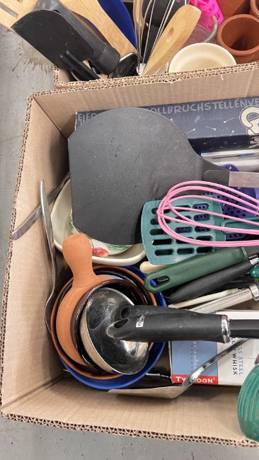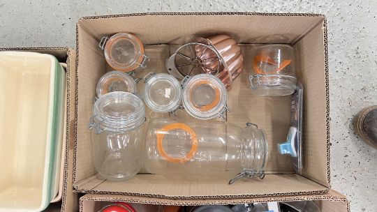 12 X BOXES OF ASSORTED KITCHENALIA TO INCLUDE CASSEROLE DISHES, BAKING DISHES, ASSORTED CERAMICS, GLASSWARE TO INCLUDE PYREX, BOWLS, KILNER JARS, ETC. VARIOUS KITCHEN UTENSILS TO INCLUDE SPATULAS, WHISKS, TONGS, PEELERS, STAINLESS STEEL CHAMPAGNE BUCKET, COFFEE PERCOLATORS, AMONG OTHER EXAMPLES.