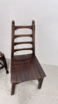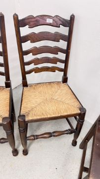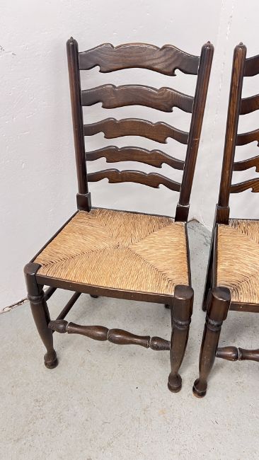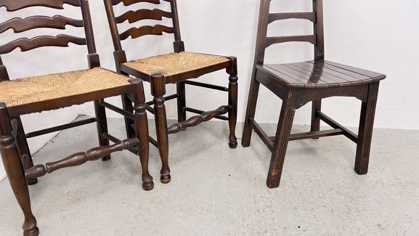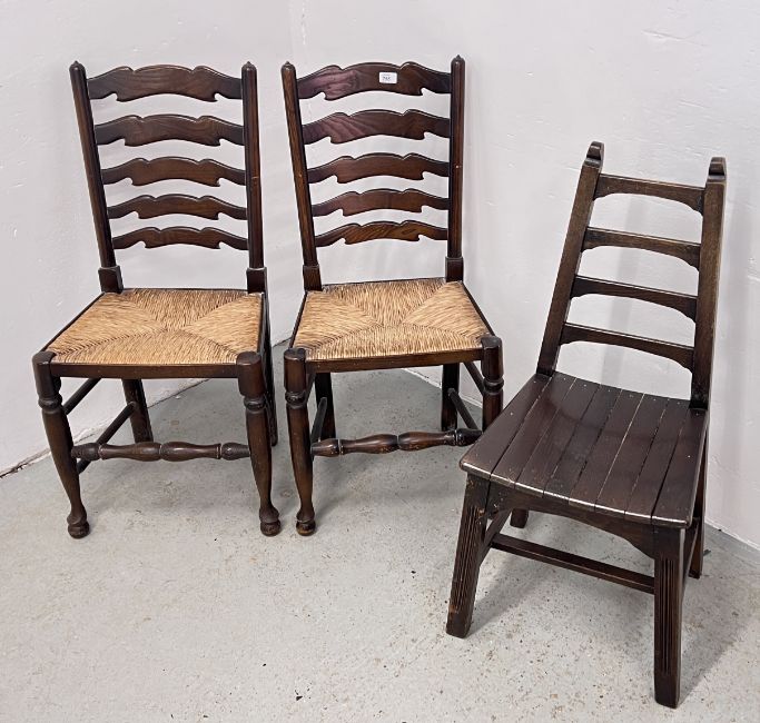 A PAIR OF OAK LADDER BACK SIDE CHAIRS WITH WOVEN RUSH SEATS ALONG WITH SINGLE OAK HALL CHAIR.
