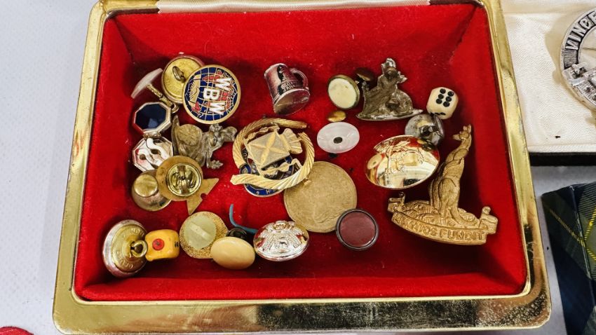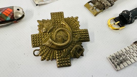 A BOX OF ASSORTED COLLECTABLES TO INCLUDE VINTAGE POCKET KNIVES, VINTAGE CAP BADGES TO INCLUDE NORFOLK REG EXAMPLE, CUFF LINKS AND ENAMEL BADGES, 4 WATCHES TO INCLUDE A VINTAGE AVIA DAYTYME EXAMPLE, SCOTTISH BROOCH + A VINTAGE ENGRAVED CHINESE BRASS LOCK.
