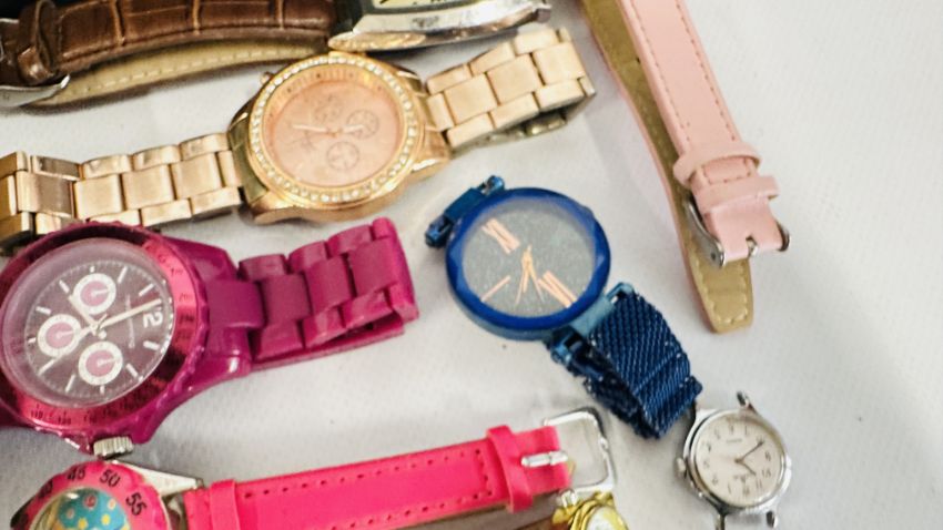 3 X TRAYS CONTAINING AN EXTENSIVE GROUP OF ASSORTED COSTUME JEWELLERY BEADED NECKLACES, BANGLES, EARRING ETC. + A BASKET OF ASSORTED WATCHES TO INCLUDE DESIGNER BRANDED.