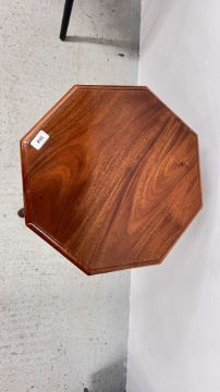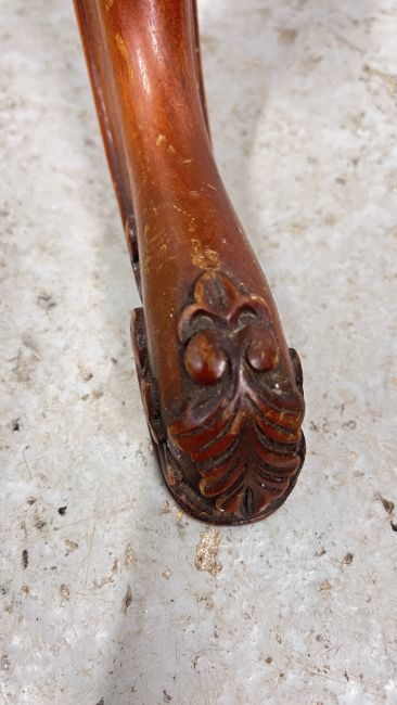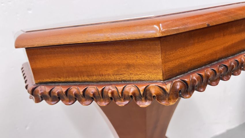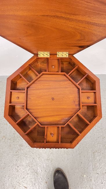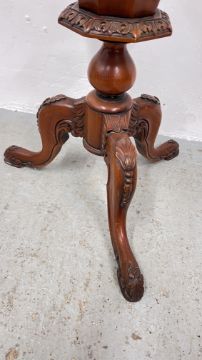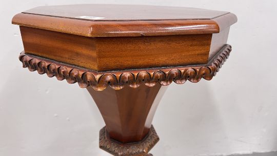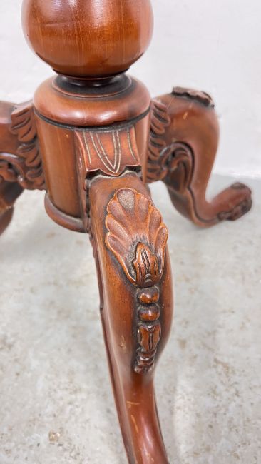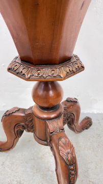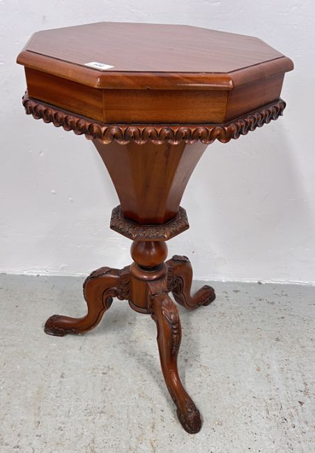 REPRODUCTION ORNATELY CARVED TRUMPET SEWING TABLE WITH HINGED TOP, HEIGHT 70CM.