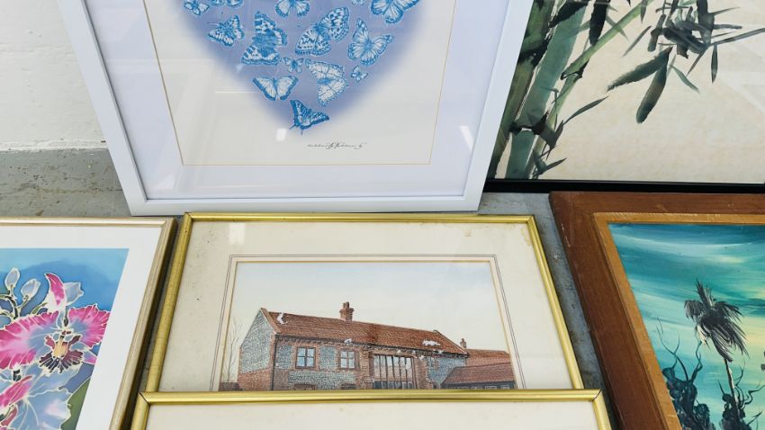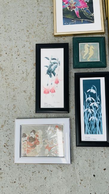 A GROUP OF ASSORTED FRAMED ARTWORKS TO INCLUDE SOME OF ORIENTAL DESIGN, WATERCOLOURS MARKED M BENSLEY, FABRIC ART, ETC.