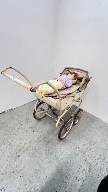 A 1950s COACH BUILT DOLL'S PRAM ALONG WITH TWO VINTAGE COMPOSITE BODY DOLLS.