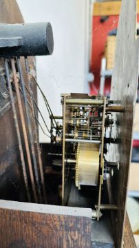 A MODERN OAK GRANDMOTHER CLOCK, THE ARCHED DIAL INSCRIBED 'TEMPUS FUGIT', MOVEMENT WITH STRIKE ON GONGS, HEIGHT 171CM.