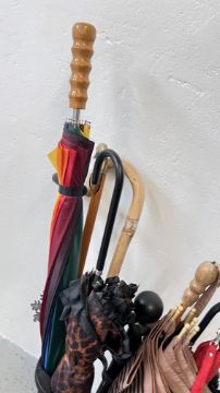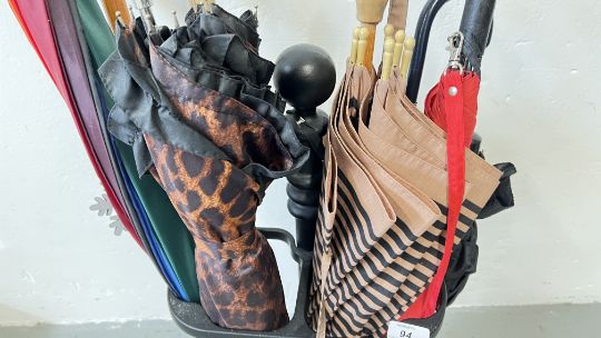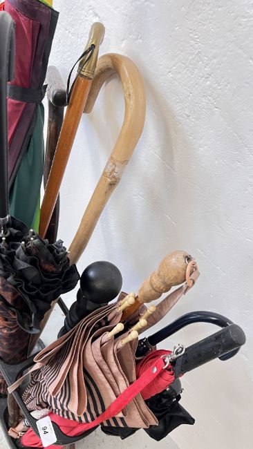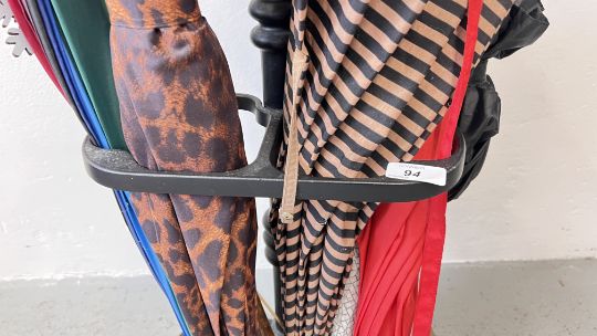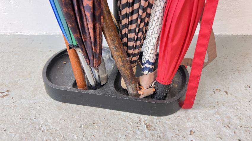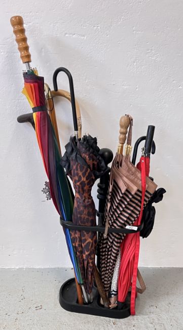 A MODERN CAST METAL STICK STAND WITH ASSORTED UMBRELLAS AND STICKS.