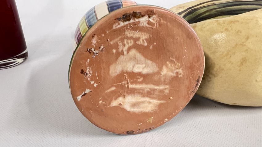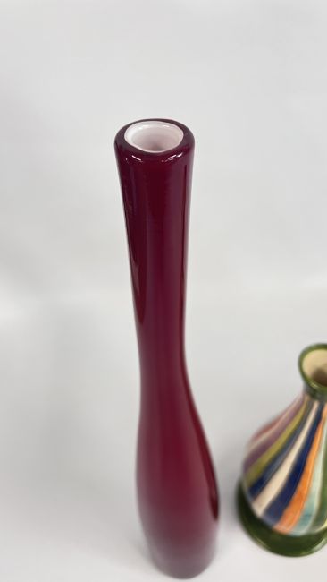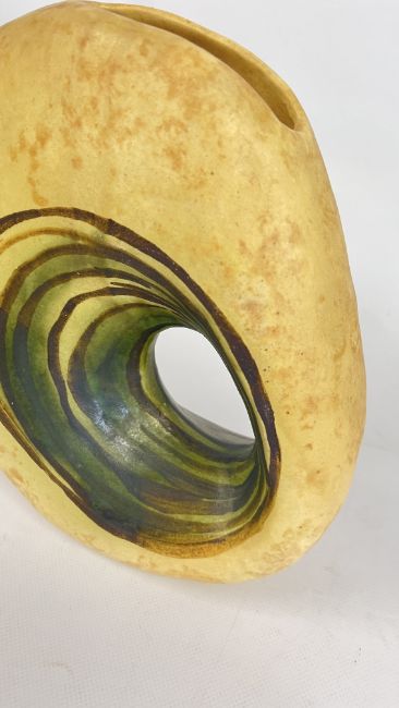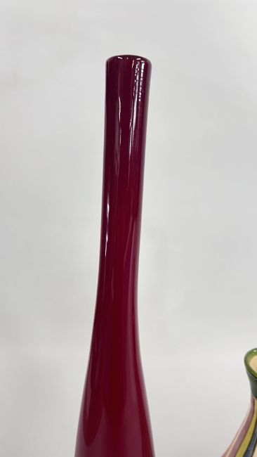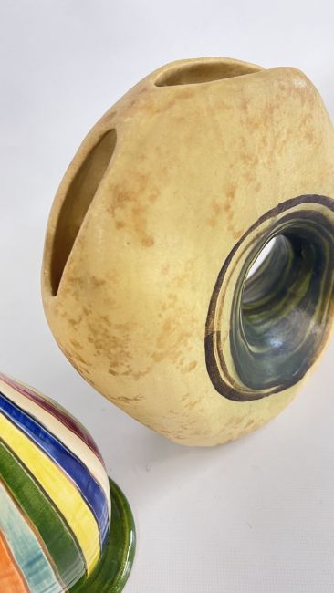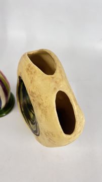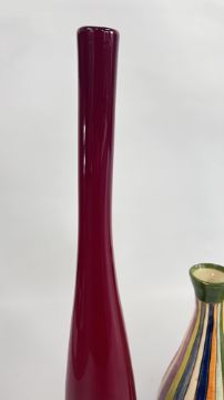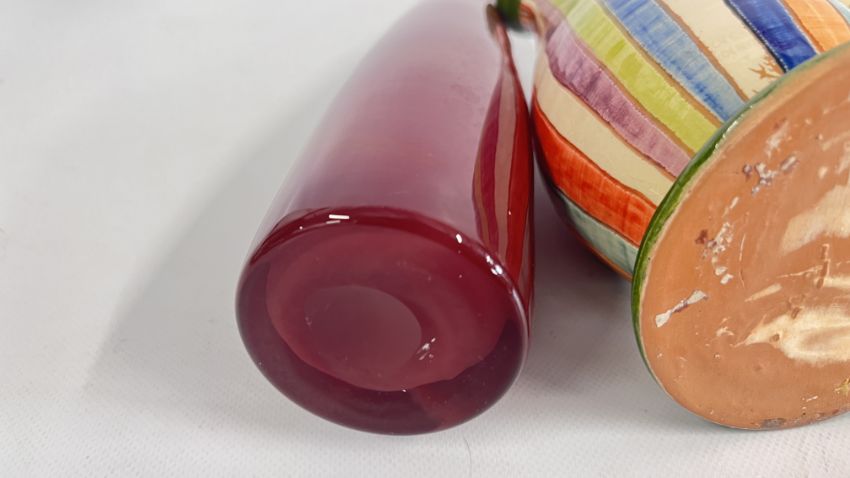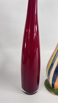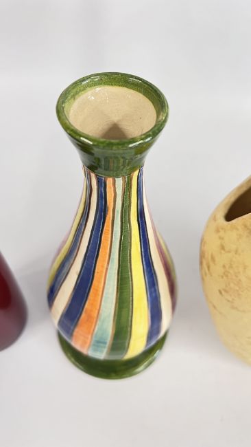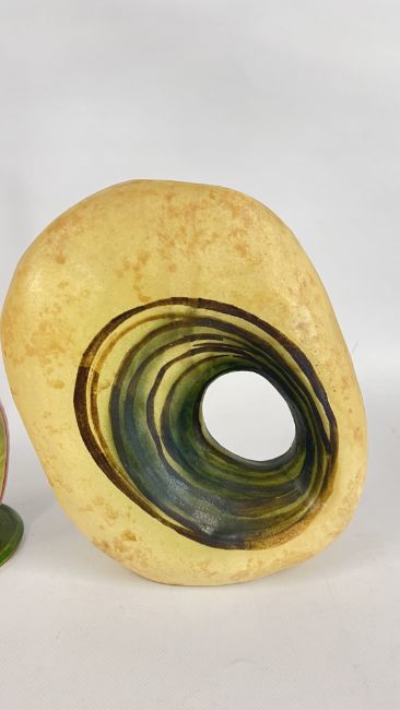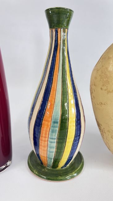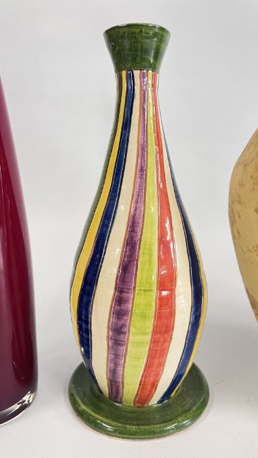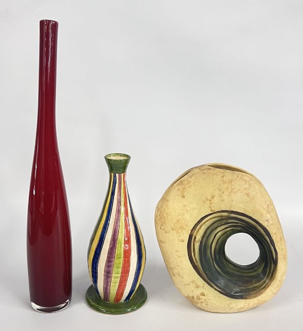 A MID CENTURY VASE BY NIKOS DAZELIDIS (ATHENS 1938) + A FURTHER CERAMIC VASE AND A GLASS EXAMPLE.