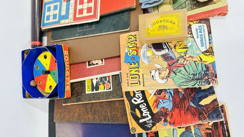 A GROUP OF VINTAGE GAMES TO INCLUDE CHESS BOARDS AND SET, TOY FORT, ROULETTE ETC.