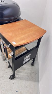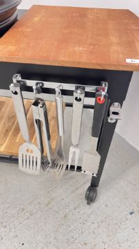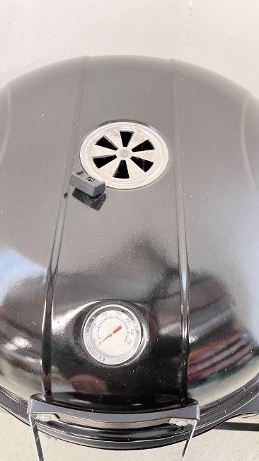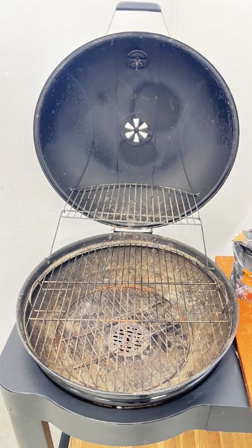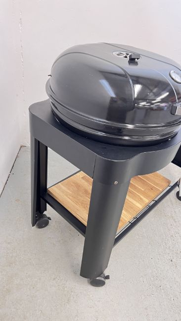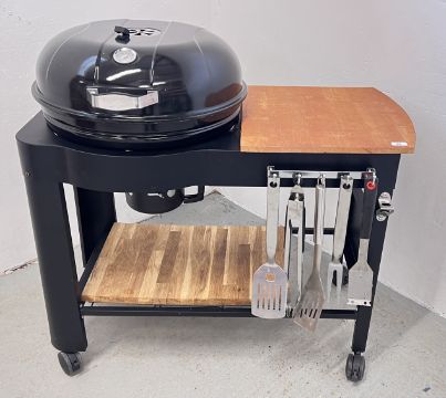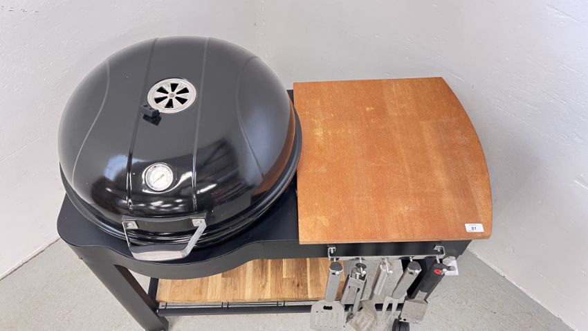 A KETTLE STYLE CHARCOAL BBQ COMPLETE WITH BBQ TOOLS.
