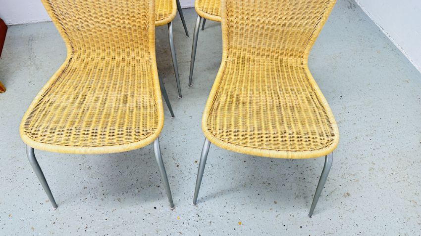 A SET OF 4 WICKER CHAIRS SUPPORTED ON A METAL FRAME.