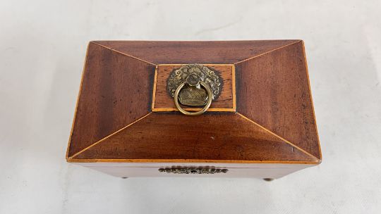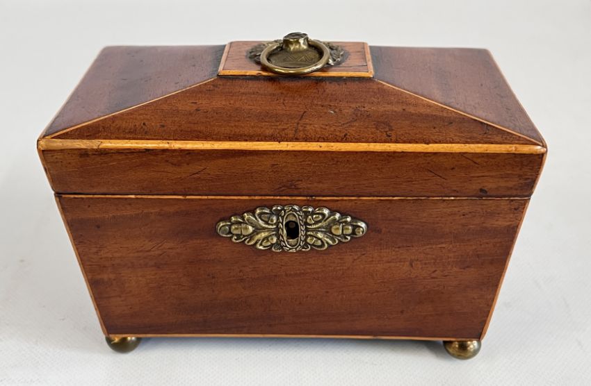 A LATE GEORGIAN MAHOGANY SARCOPHAGUS CADDY ON FOUR BRASS BALL FEET, W 20 X H 14.5 X D 11CM.